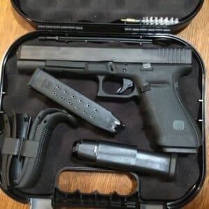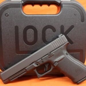 Item #: PG-41301-03 Manufacturer: Glock Model #: Gen 4 41 Type: Semi-Automatic Pistol Finish: Black Matte Stock: Black Polymer Sights: FT: White Dot RR: Adjustable with White Outline Barrel Length: 5.45″ Overall Length: 8.44″ Caliber: 45AP Capacity: 13+1 Action: Safe Action # of Mags: 3 Packaging: Black Plastic Case Receiver: Black Polymer with Accessory Rail Features: Magazine Loader, Cleaning Rod and Brush Interchangeable Backstrap, Reversible Mag Release