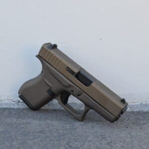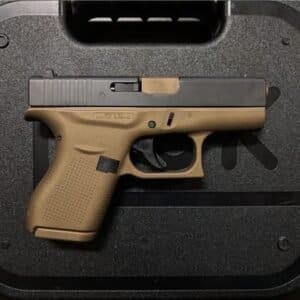 MODEL:G43 Battlefield Green TYPE:Semi-Auto Pistol ACTION:Safe Action FINISH:Gas Nitride STOCK/FRAME:Battlefield Green Polymer Frame CALIBER/GAUGE:9mm CAPACITY:6+1 # OF MAGS:2 MAGAZINE DESC:6 rd. BARREL:3.39″ OVERALL LENGTH:6.26″ SIGHTS:Fixed SAFETY:3 Safeties GUN CASE:Plastic