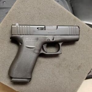 MODEL:G43 PI4350201 TYPE:Semi-Auto Pistol ACTION:Safe Action FINISH:Gas Nitride STOCK/FRAME:Polymer Frame STOCK/GRIPS:Black Polymer CALIBER/GAUGE:9mm CAPACITY:6+1 # OF MAGS:2 MAGAZINE DESC:6 rd. BARREL:3.39″ OVERALL LENGTH:6.26″ SIGHTS:Fixed SAFETY:3 Safeties GUN CASE:Plastic