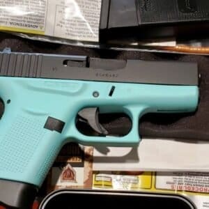 Item #: PI4350201RESA Brand: Glock Model: 43 Manufacture (Davidson’s Special Edition) Type: Pistol: Semi-Auto Caliber: 9MM Finish: Cerakote Shimmering Aluminum Action: Safe Action Stock: Cerakote Robins Egg Blue Sight: FT: White Dot RR: White Outline Barrel Length: 3.39 Overall Length: 6.26 Weight: 16.19 oz Capacity: 6+1 # of Mags: 2 (1 Flat Base, 1 with Finger Extension) Safety: Safe Action – 3 Separate Automatic Safeties Receiver: Cerakote Robins Egg Blue Packaging: Black Plastic Case Features: Davidson’s Special Edition; Width 1.02